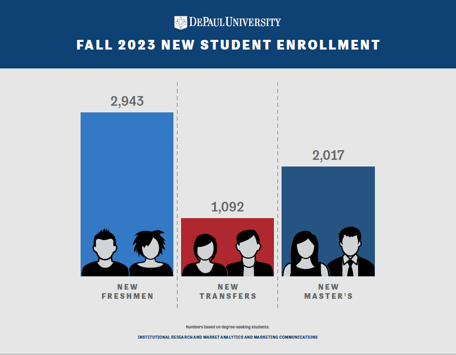 The Enrollment Summary, the Freshman Admission Summary, and Fall Enrollment Infographics, published annually by Enrollment Management and IRMA, summarize trends in DePaul's enrollment profile.