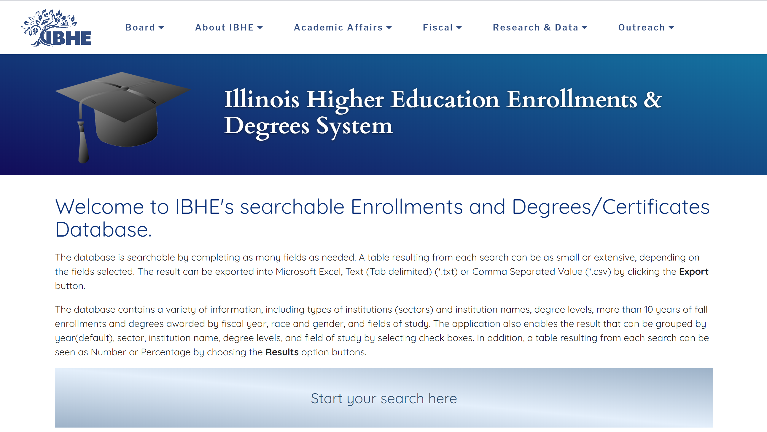 This page contains information about relevant external resources related to higher education data including IBHE, IPEDS, the Student Achievement Measure (SAM), etc.