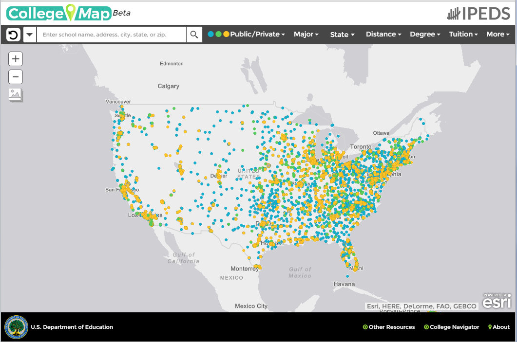 The IPEDS College Map Tool is an interactive mapping tool that allows the user to search for institutions by physical location, with supplementary information provided to assist in narrowing down a search, such as: major offered, tuition pricing, on-campus housing, campus type/size, etc. This tool also allows a user to accurately comprise a list of the most relevant competitors, and supplement with additional IPEDS data.