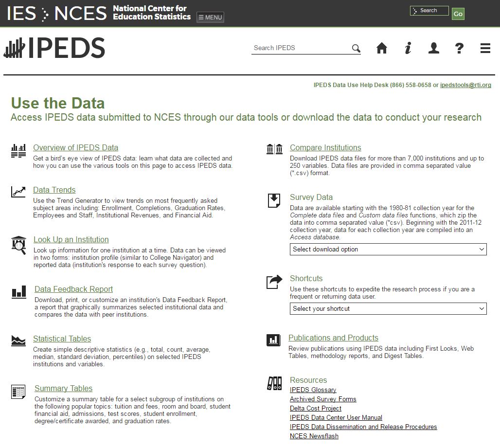 IPEDS is a system of interrelated surveys conducted annually by the U.S. Department's National Center for Education Statistics (NCES). IPEDS gathers information from every college, university, and technical and vocational institution that participates in the federal student financial aid programs. Data available includes: enrollments, program completions, graduation rates, faculty and staff, finances, institutional prices, and student financial aid. These data are made available to students and parents through the