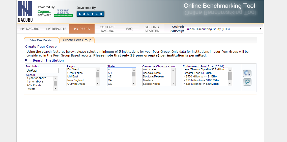 To utilize this tool, you will need to create a NACUBO account. After signing in, you will be redirected to the membership-only Web page. Scroll down this page until you see the Online Research box, select the link to NACUBO Online Benchmarking Tool link and select the Tuition Discounting Study (TDS) radio button. Once you are on the tool, you can view an instructional video for how to use the tool by selecting the "Getting Started" link, or you may view the video by going here.